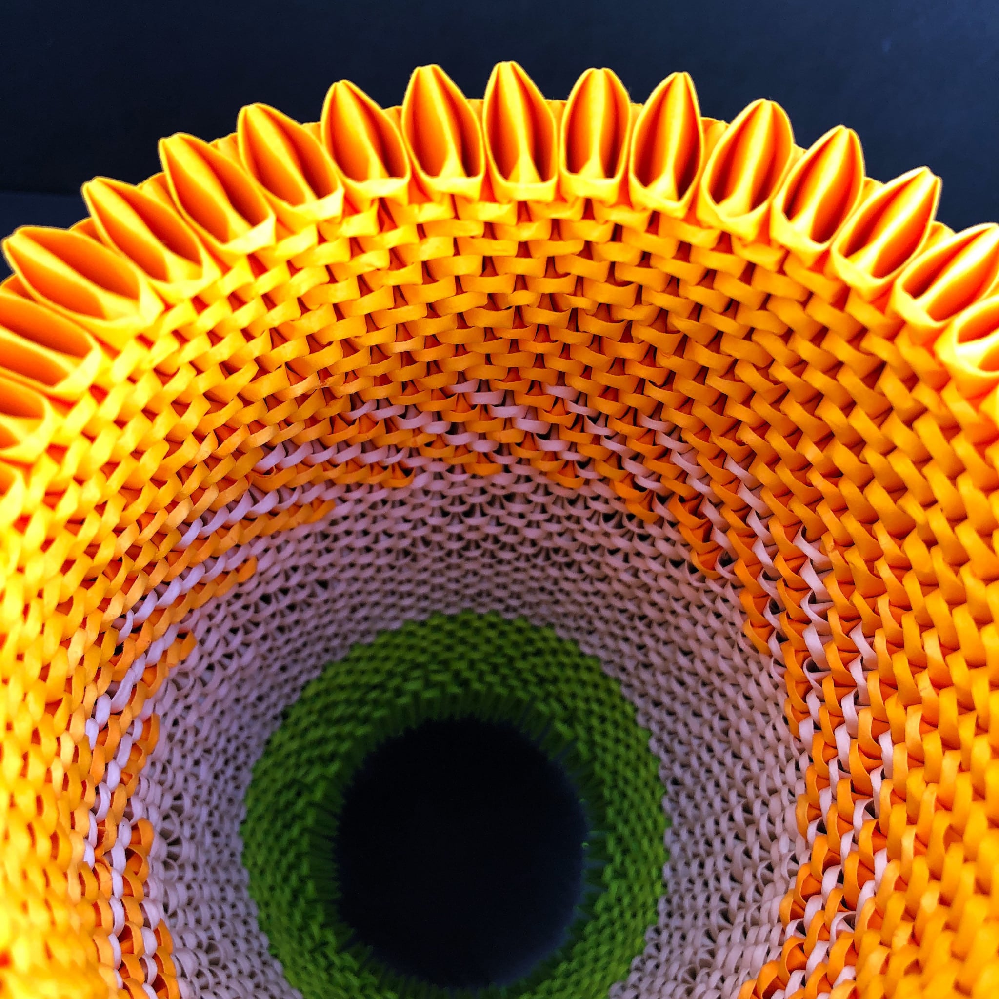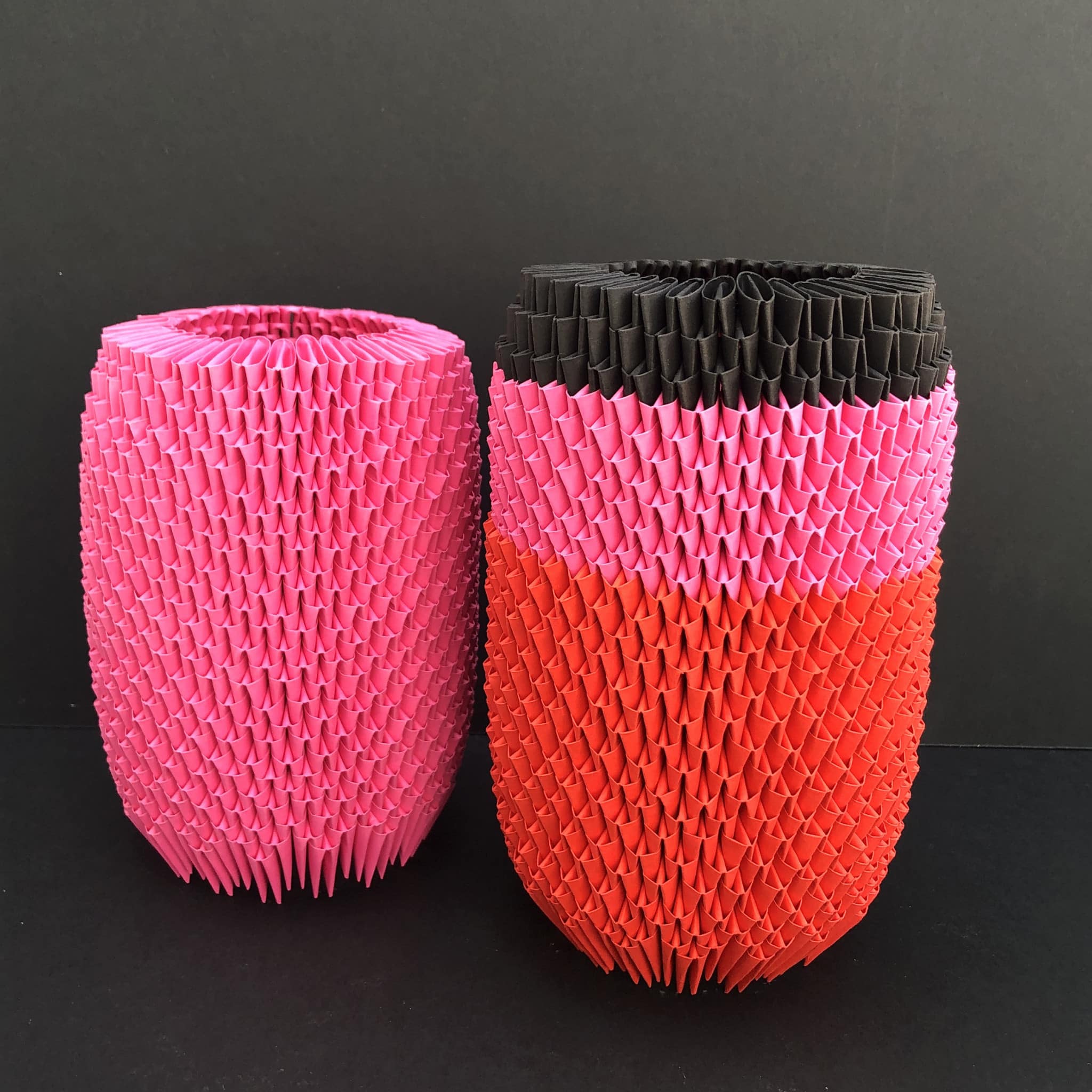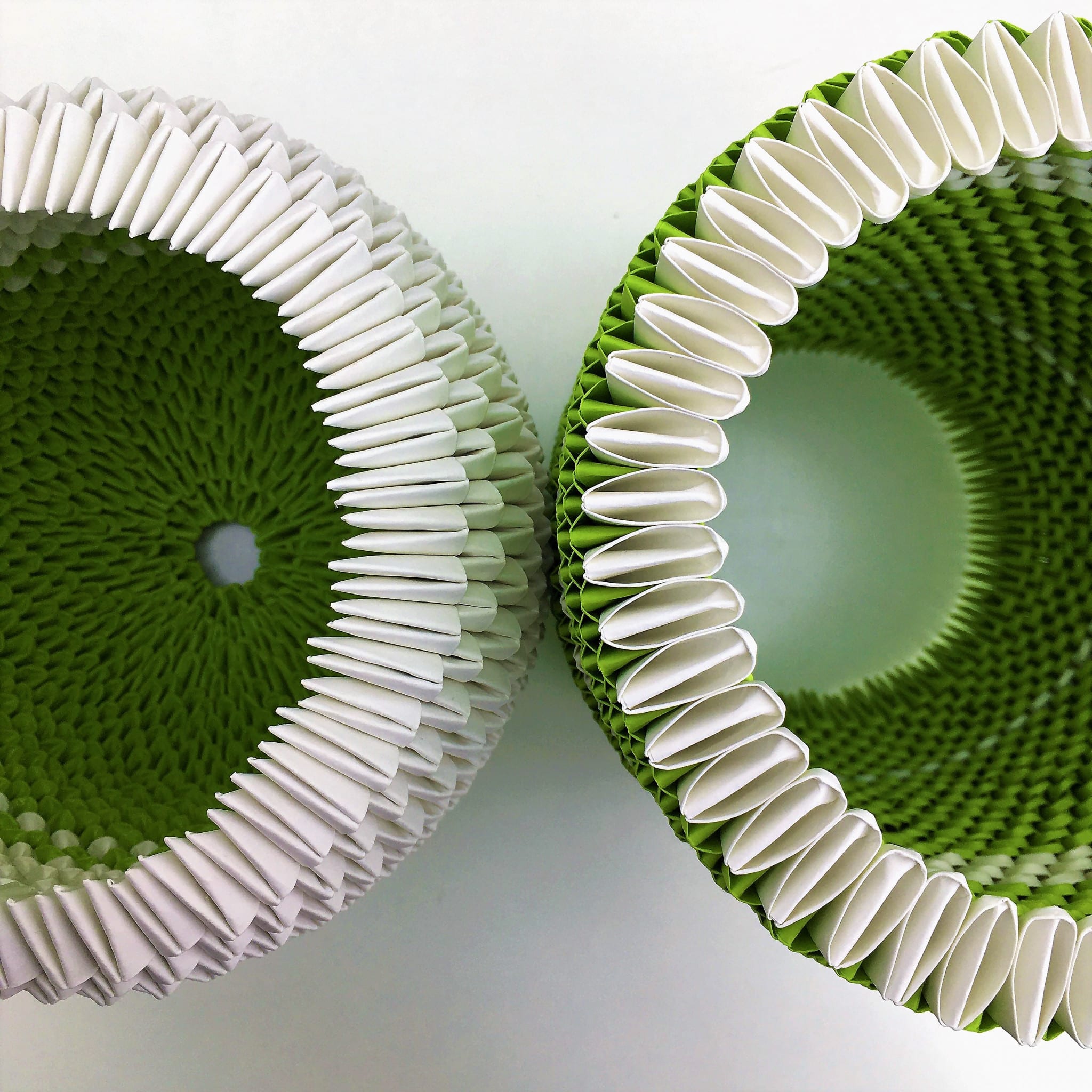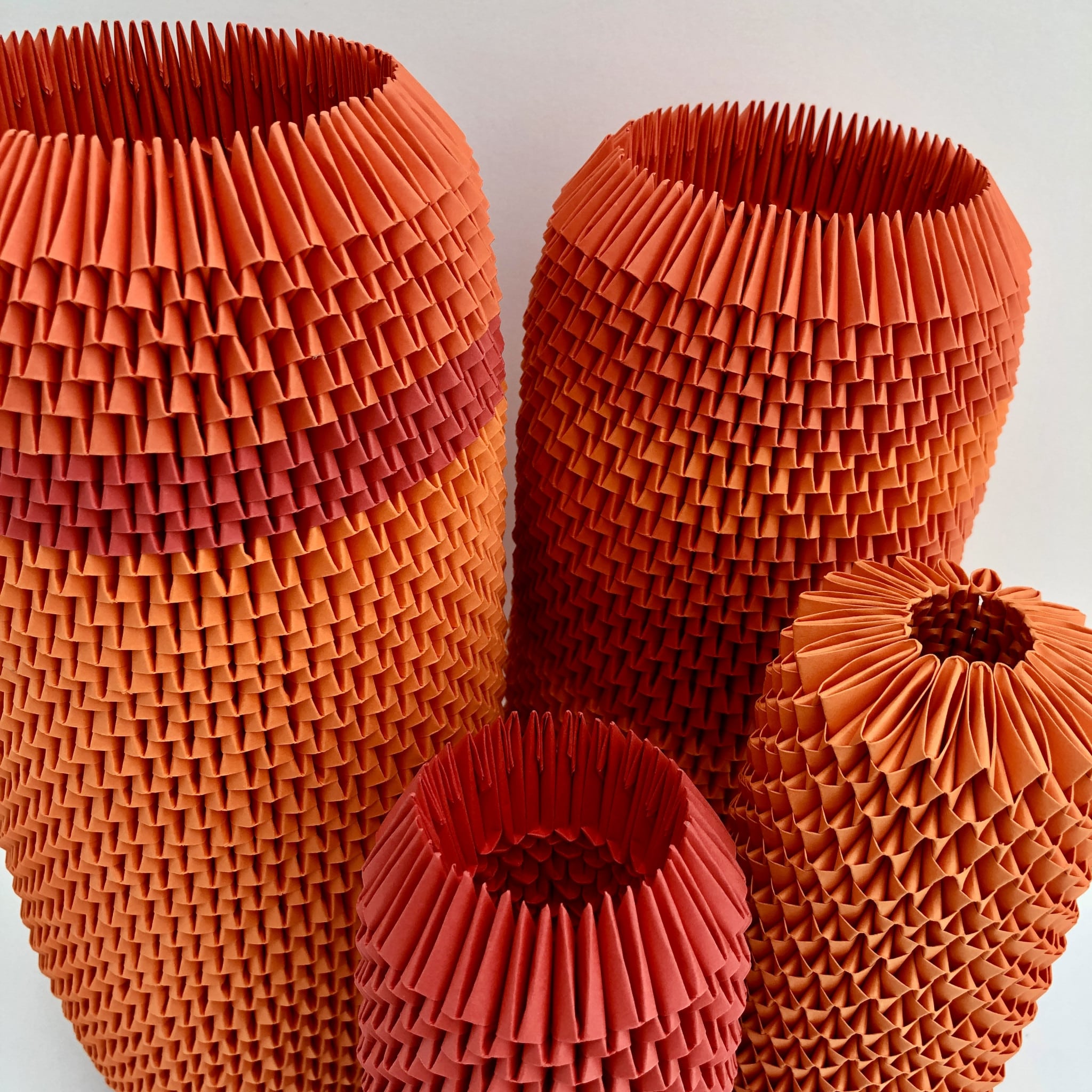 Aus hunderten kleiner Papiermodule entstehen faszinierende organische Objekte. Das Gesamtbild erscheint exakt gearbeitet, die Handarbeit des Ineinander-Steckens und die damit verbundene „Handschrift“ ist jedoch immer gut ablesbar.