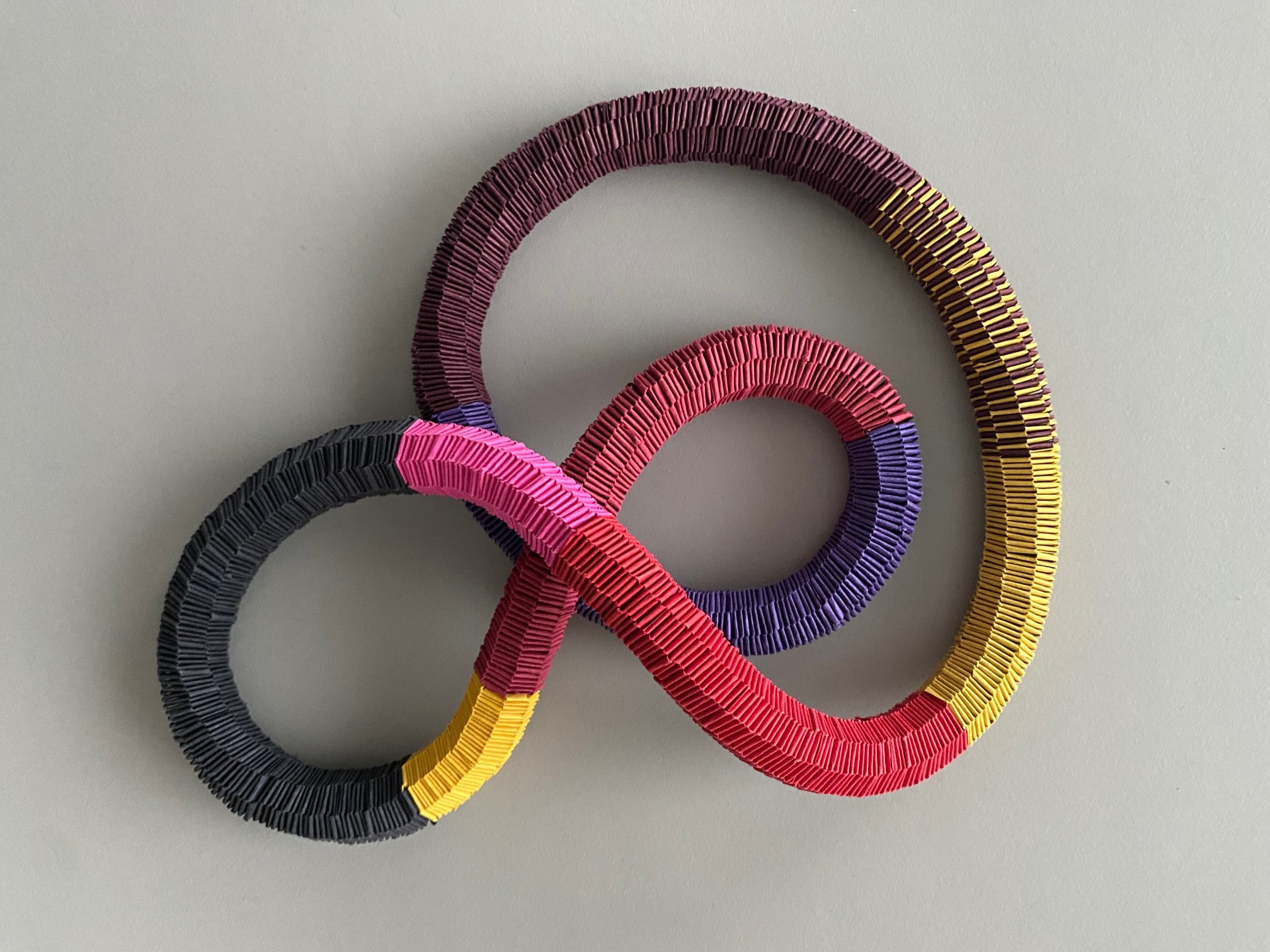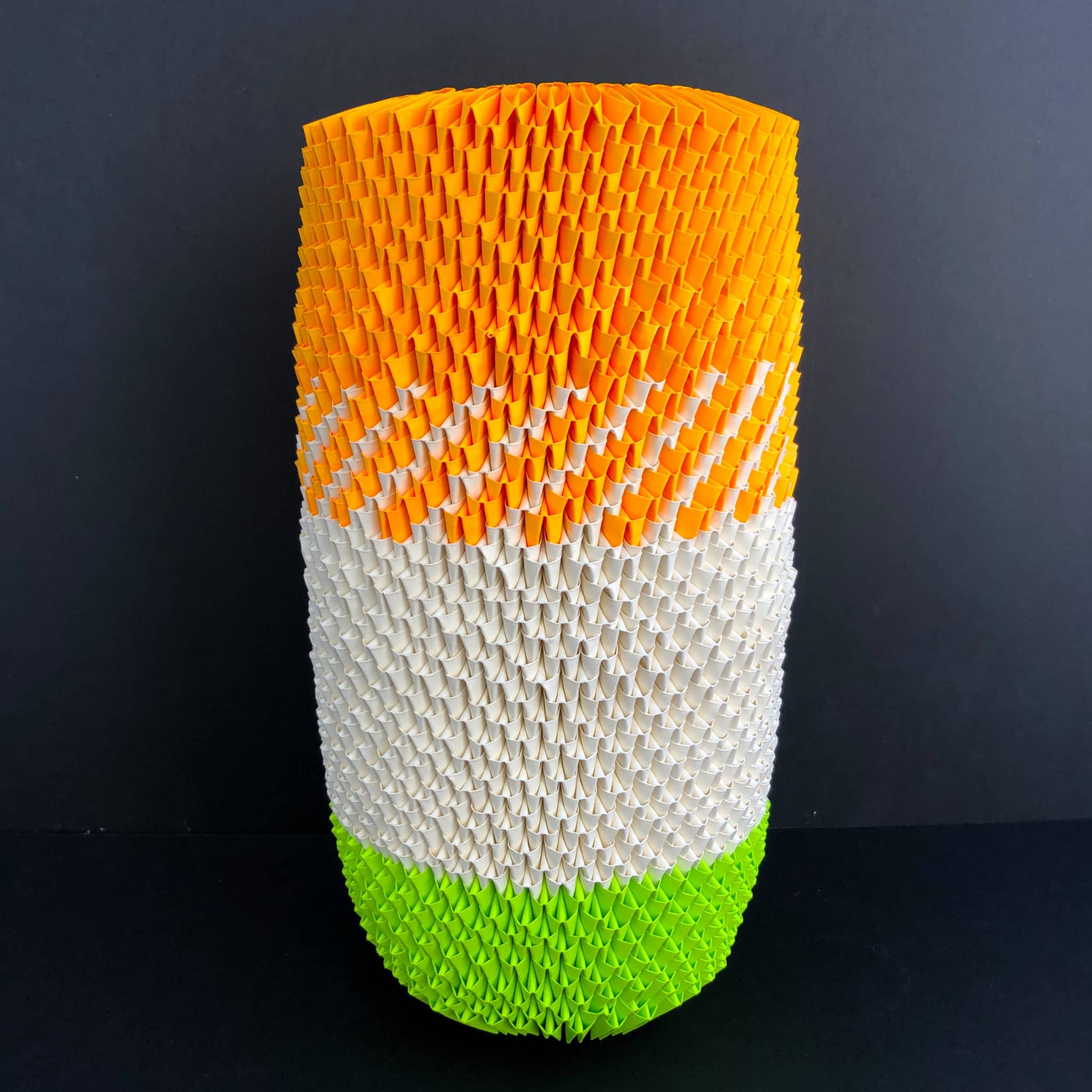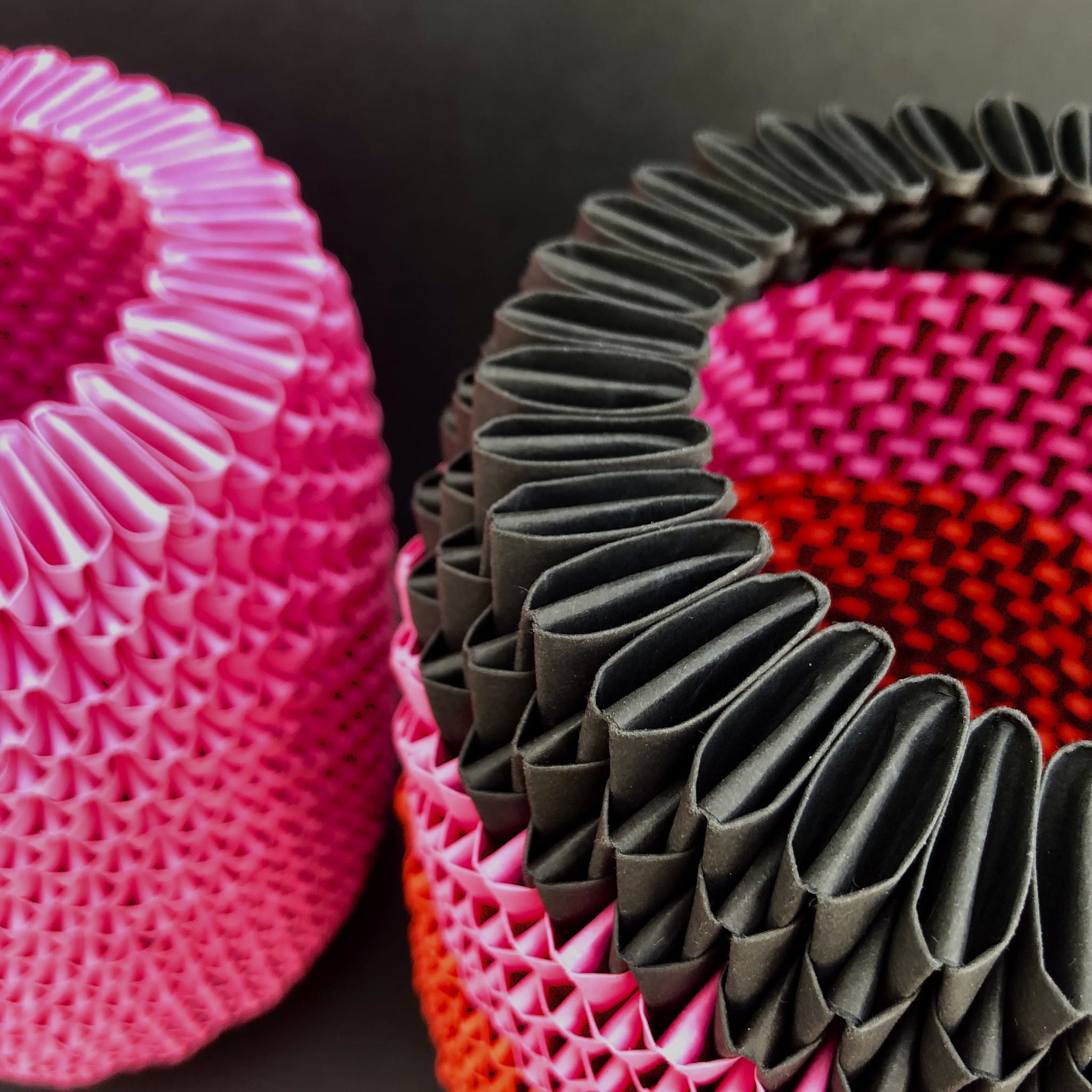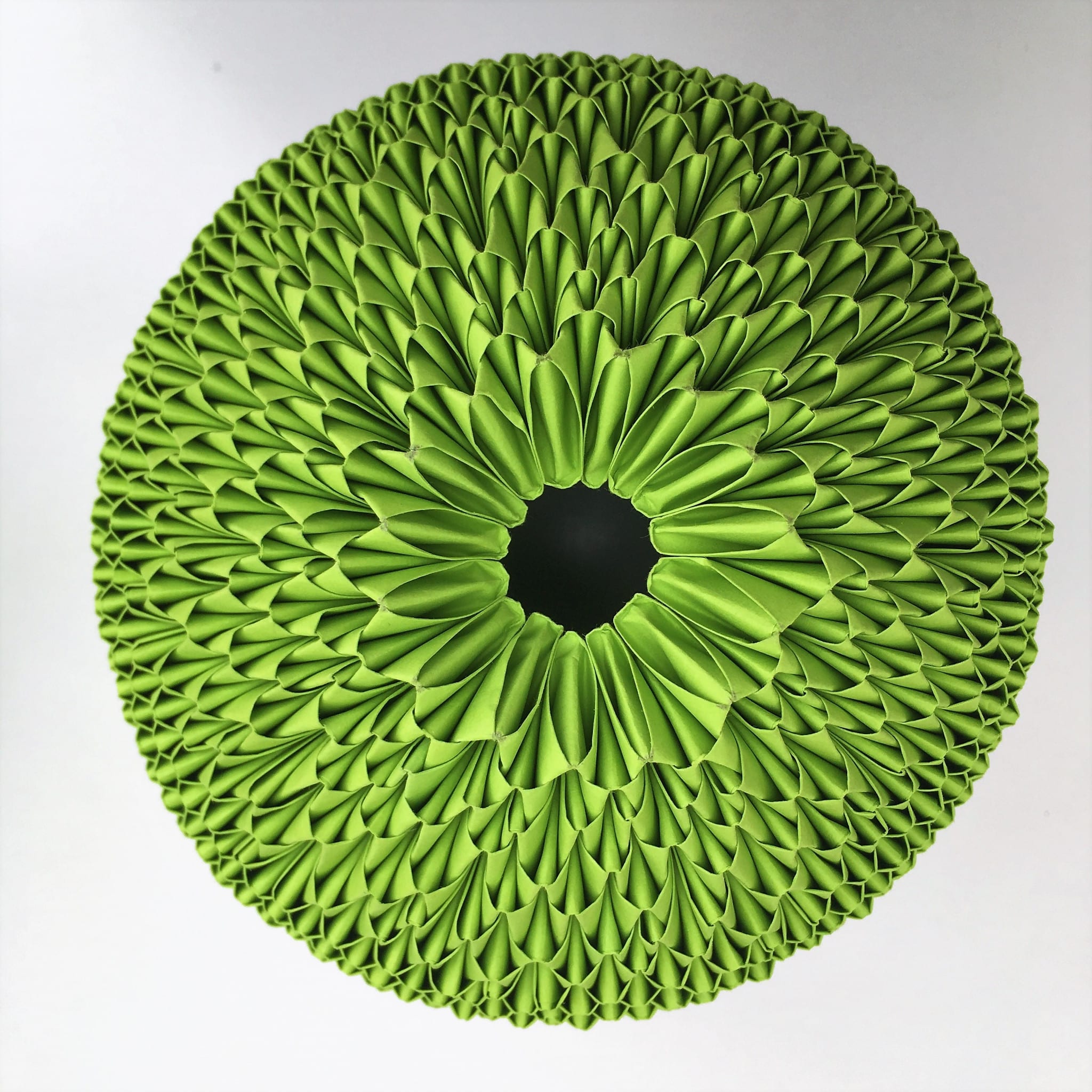 Aus hunderten kleiner Papiermodule entstehen faszinierende organische Objekte. Das Gesamtbild erscheint exakt gearbeitet, die Handarbeit des Ineinander-Steckens und die damit verbundene „Handschrift“ ist jedoch immer gut ablesbar.